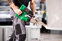 The FUSION 3C extrusion welder is great for equipment and container construction. The extruder also stands out with its sensible design. While the motor is installed on top, the handle and blower are located on the bottom of the tool.