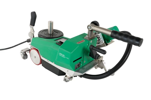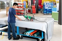 Equipped with a durable brushless motor operating at 18,000 rpm, it offers high welding power with reduced maintenance . The maximum speed of the automatic welder is 16 m/min (52.5 ft/min). The advanced HMI features an intuitive user interface, simplifying operation and increasing productivity. Equipped with a full set of features and standard accessories, the UNIPLAN 510 delivers advanced capabilities for a broad range of welding applications. Suitable for welding overlaps, hems, and piping on various industrial fabrics, the UNIPLAN 510 is ideal for both table and floor use. It includes an integrated material lifting device, reducing manual handling and increasing process safety. The swivel lever nozzle engagement allows quick and secure nozzle insertion, essential for precise performance in demanding applications. The exceptional stability provided by the extended inclined bar and swivel castor ensures stable movement and straight travel, improving welding quality. Accessories such as the folding support bar, hem guide, lifting device, additional weights, brass brush, and nozzle adjustment gauge are included, ensuring the UNIPLAN 510 is ready for immediate and efficient use in various production environments.