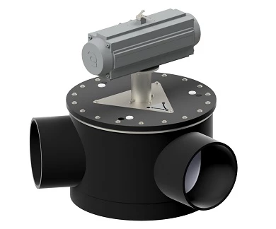 PL-3WAY er en unik 3-vejs ventil til fisketransport, som kan anvendes til vand/væsker uden fast materiale. Ventilen fås i dimensionerne fra ø90mm til ø400mm. Udover et glat gennemløb, har ventilen også stor radius på gennemløbet, således at fiskene kan ledes skånsomt gennem venti-len. Ventilen er tæt gennemløbet over til den afbændede studs. Ventilen bliver især brugt i fiskeop-drætsanlæg, hvor der stilles krav til korrosionsfrie materialer. Ventilen leveres monteret og indreguleret med pneumatisk drejeaktuator for skift mellem ventilpositioner. Drejeaktuatoren er i high corrosion protection udførelse, hvor udvendige bolte og drivaksel er i AiSi316. Ventilhuset er i aluminium og er fuld coated.