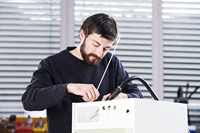LEISTER Labor S med forbindelsesboks, varmluftsapparat 800W/230V, og 3m luftslange., er et meget lille professionelt varmluftsapparat der anvendes til hæftesvejsning og trådsvejsning men også til konservatorarbejder. Apparatet skal luftforsynes fra en luftblæser eller regulerbar trykluft.