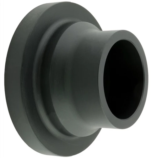Flangekrave fremstillet i sort PE100, udført som kort model til stuksvejsning og med vægtykkelse efter SDR17. Komponentet er godkendt til 10 bar for vand og er udviklet med ekstra uddrejning i centerområdet, hvilket gør den særlig velegnet til brug sammen med kontraklapventiler.